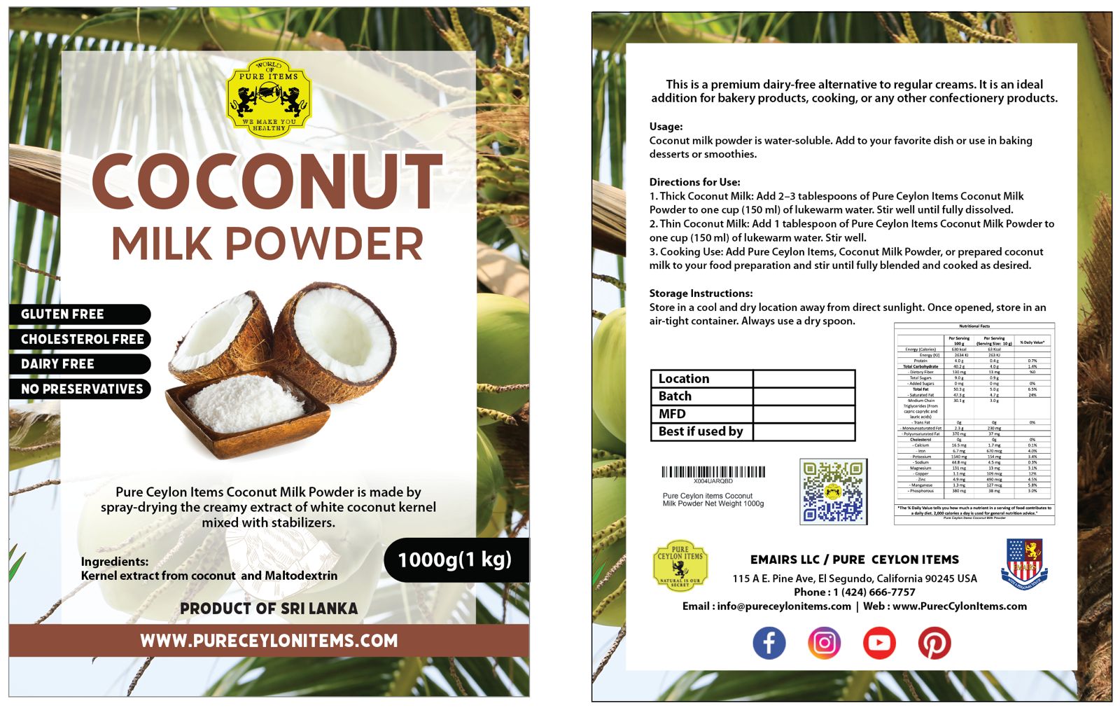 Pure Ceylon Items Coconut Milk Powder is a must for many Asian dishes as well as the Caribbean and South American cuisines. Extracted from the white meat of matured coconuts, this milk powder is filled with nutrition and makes an awesome base for your dish. This product is manufactured using the latest technology together with an Assured Quality control system. Flavor & Aroma Natural Fresh Coconut.